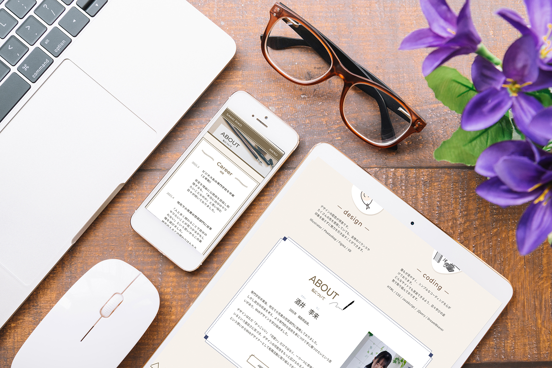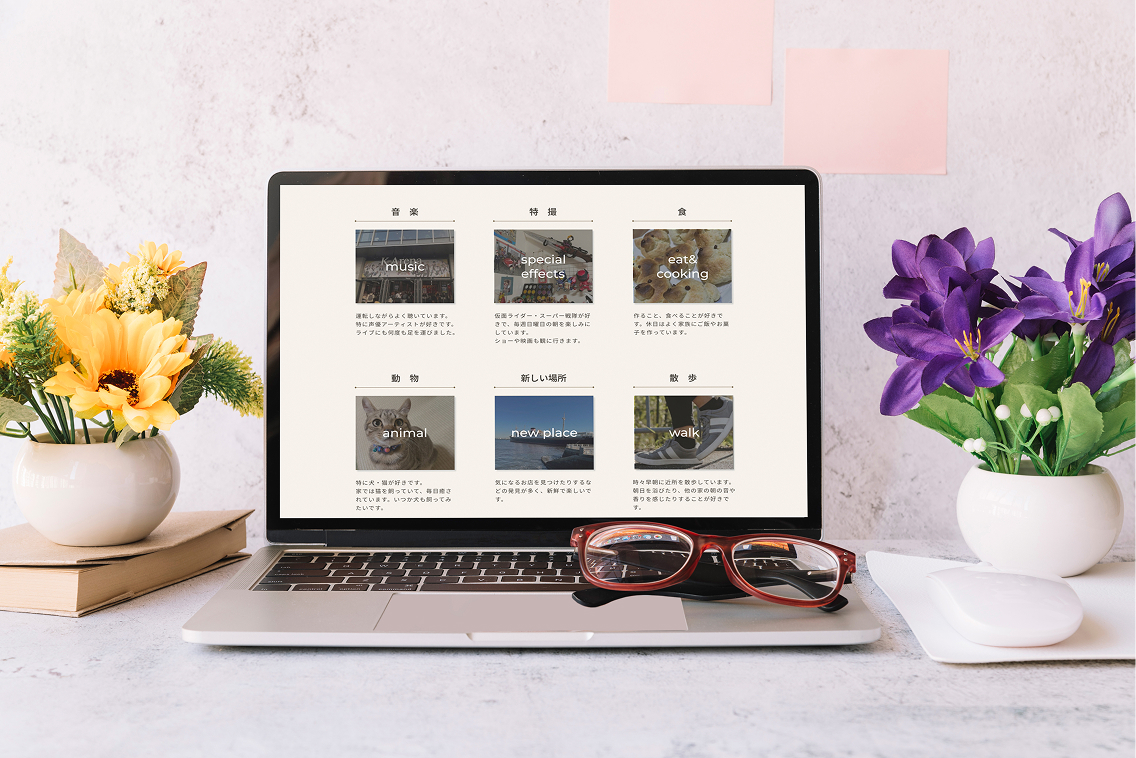 趣味についてのセクションでは普通に写真を載せると浮いて見えてしまうので、全体との配色を合わせつつ見やすいデザインを心がけました。